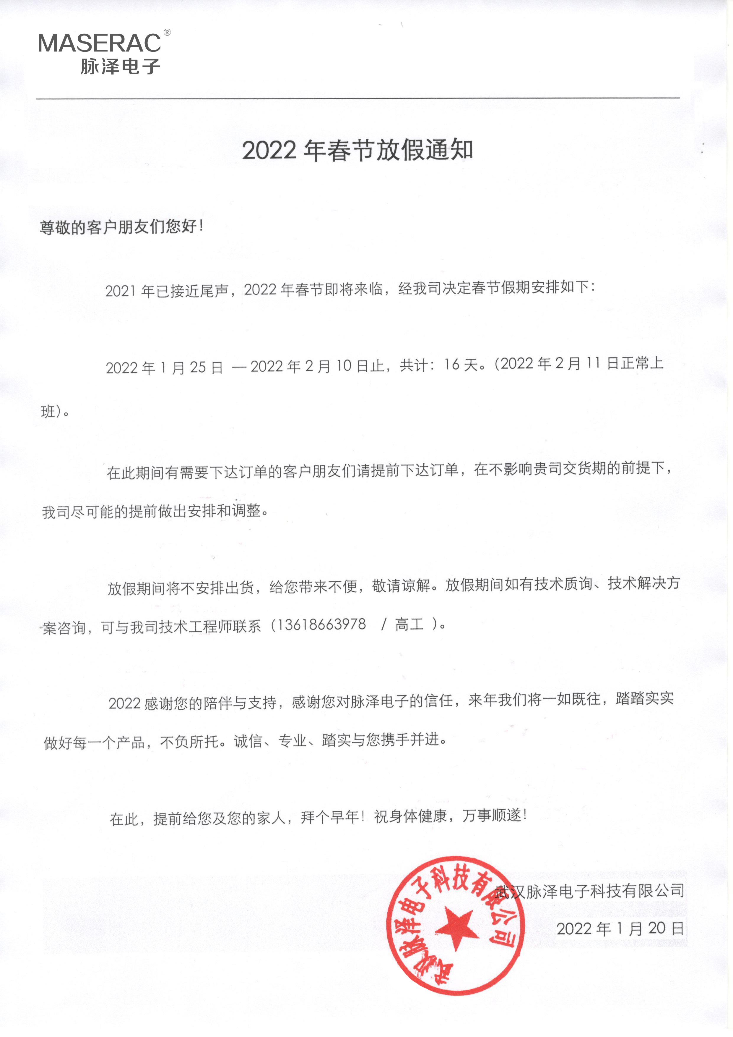 2022年春節(jié)放假通知,請廣大客戶朋友們知悉!